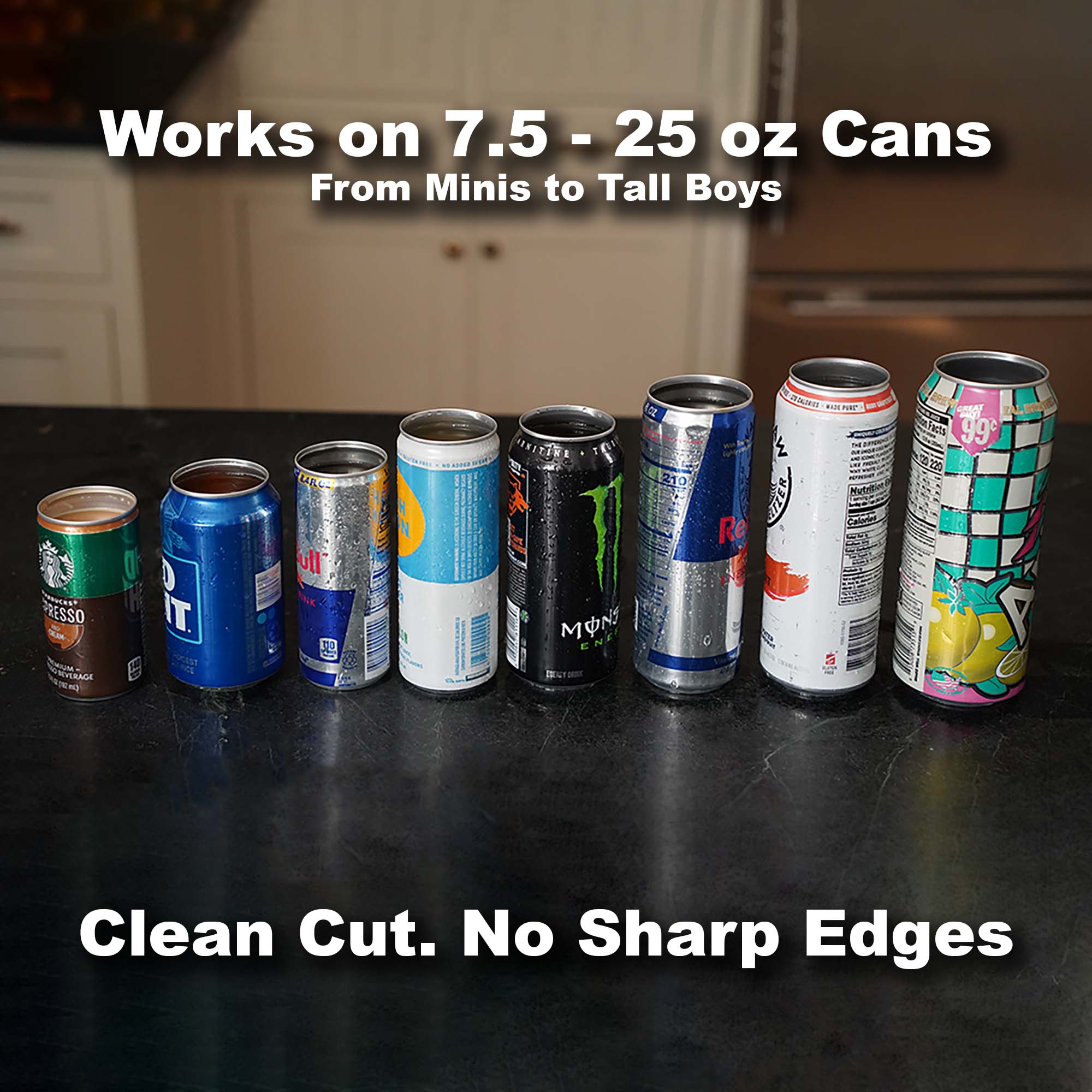 - Works on most beverage cans up to 25 oz